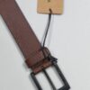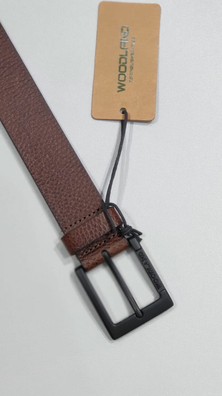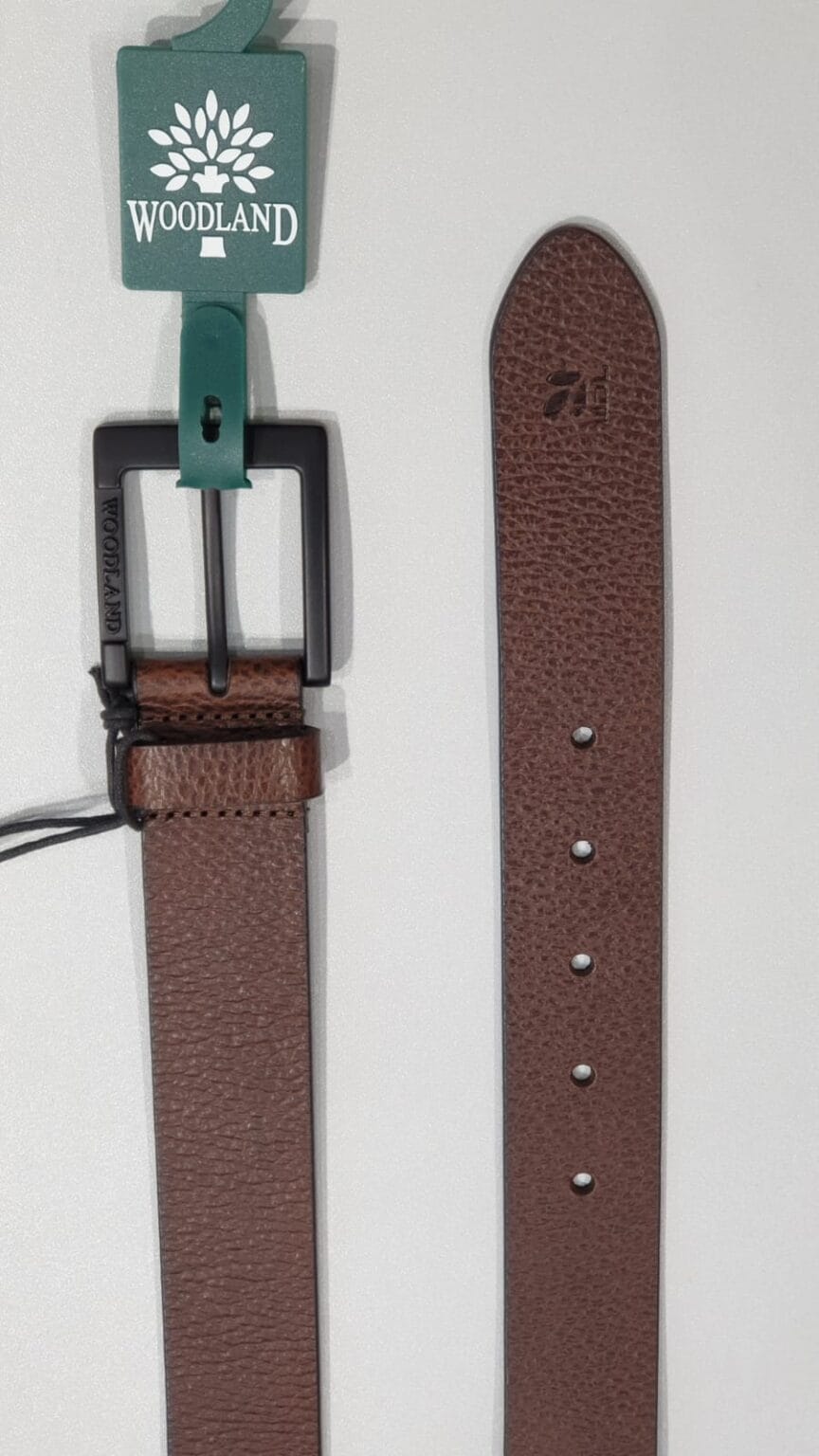 - Spruce up your look with this tan menâs leather belt from Woodland which features a beautiful textured pattern in stripes. Premium and great looking, it would accentuate the overall look of your attire and make a distinct style statement. The belt is carved out of fine leather, and will therefore maintain its quality and look for years to come. For ease of wearing, it comes with a metal buckle closure with a dull golden finish.