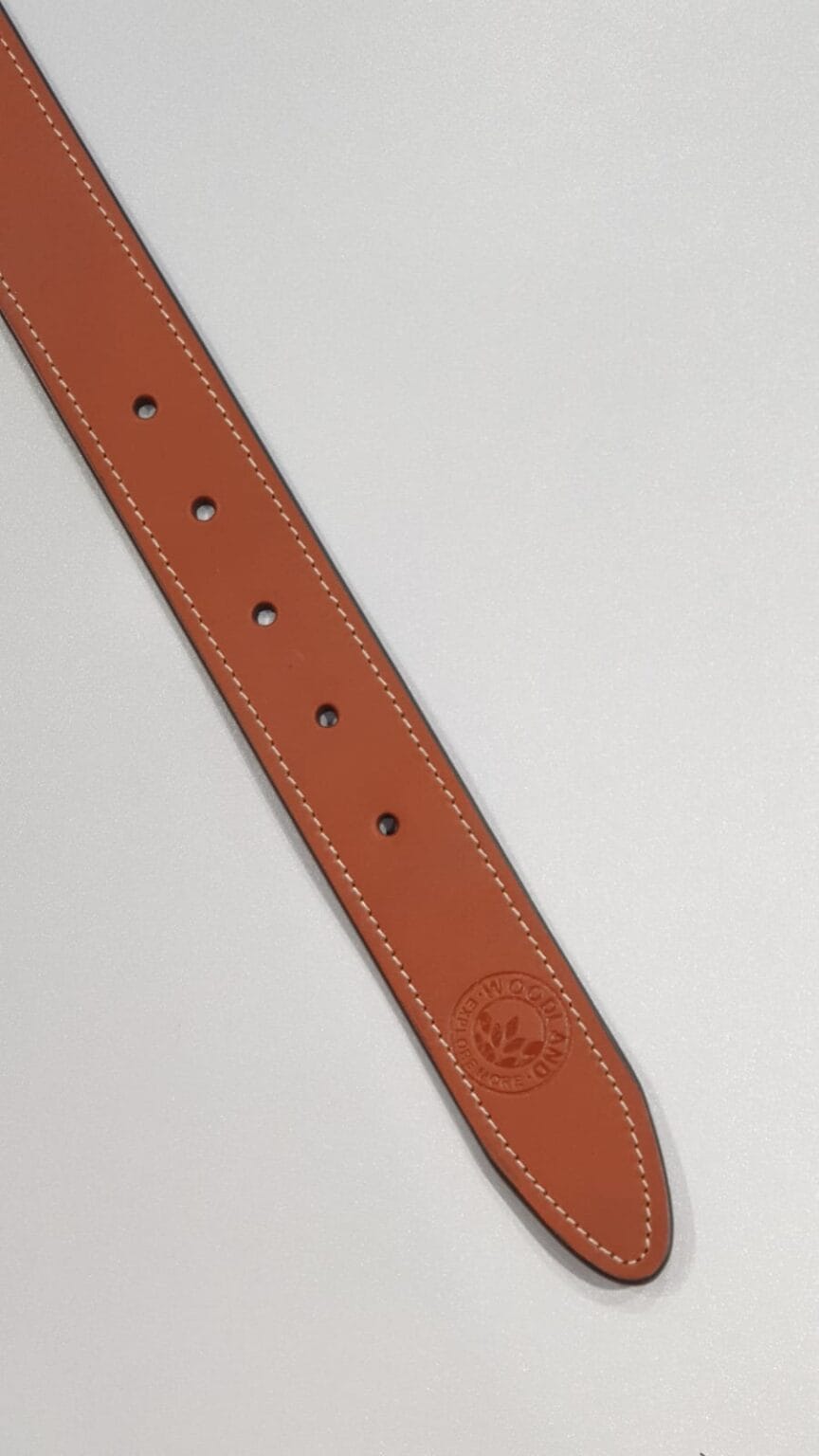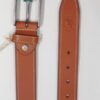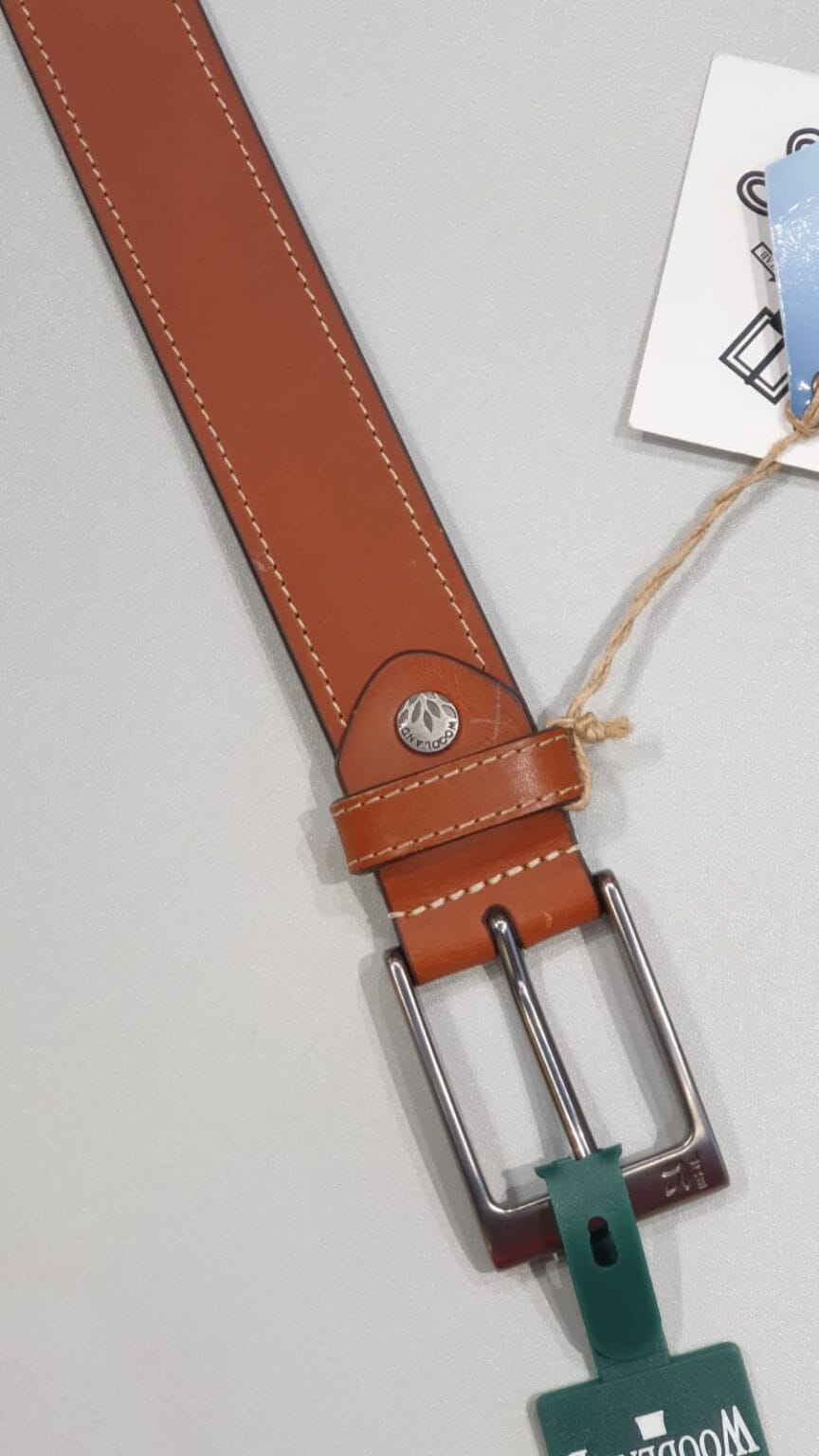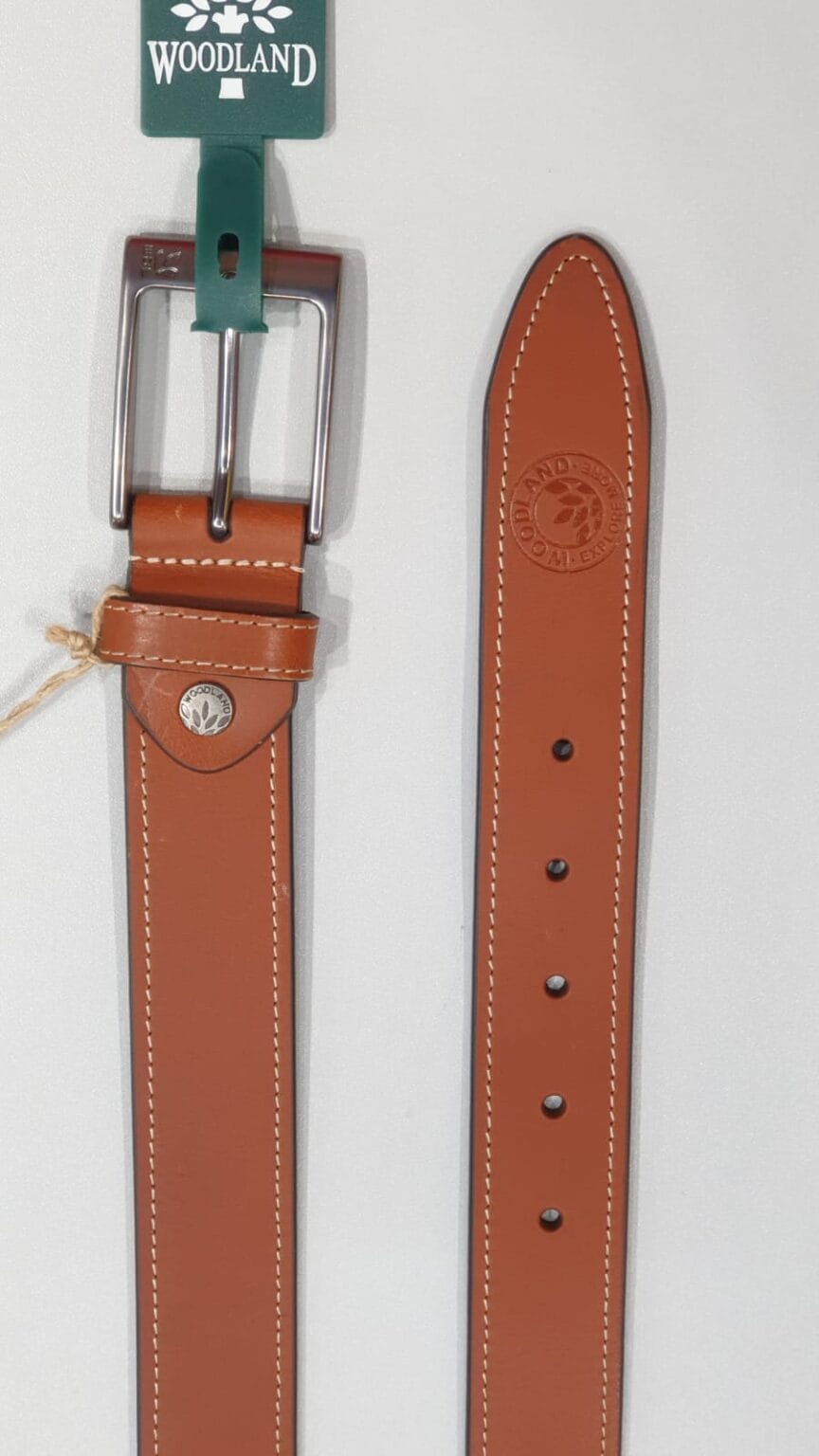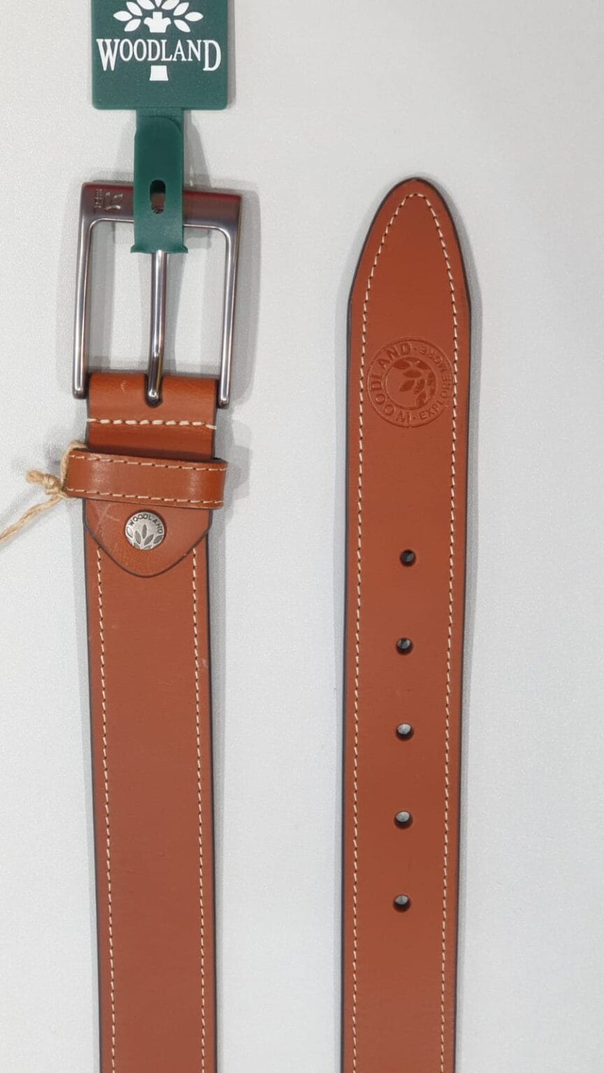 - Spruce up your look with this tan menâs leather belt from Woodland which features a beautiful textured pattern in stripes. Premium and great looking, it would accentuate the overall look of your attire and make a distinct style statement. The belt is carved out of fine leather, and will therefore maintain its quality and look for years to come. For ease of wearing, it comes with a metal buckle closure with a dull golden finish.