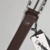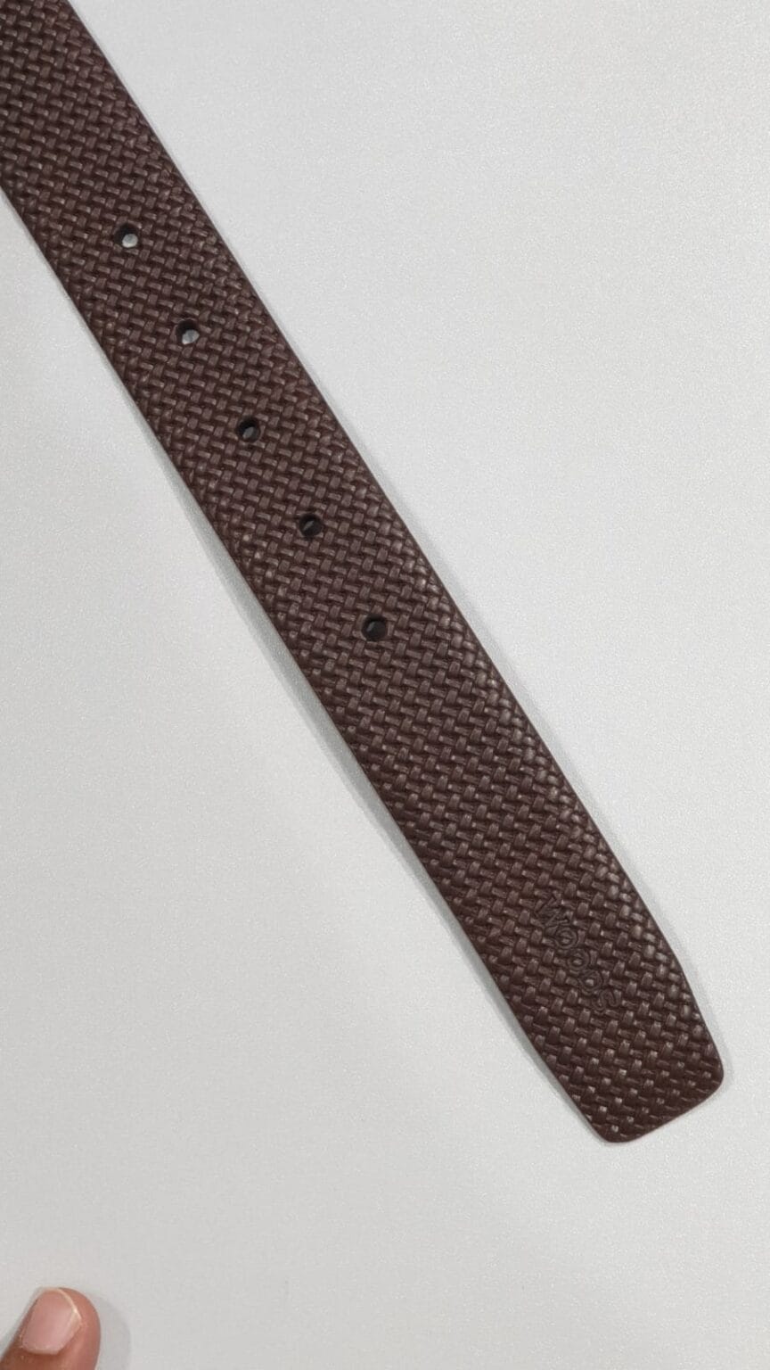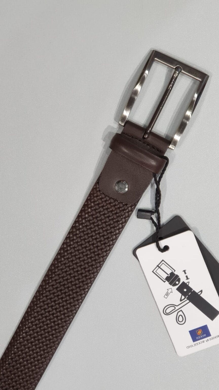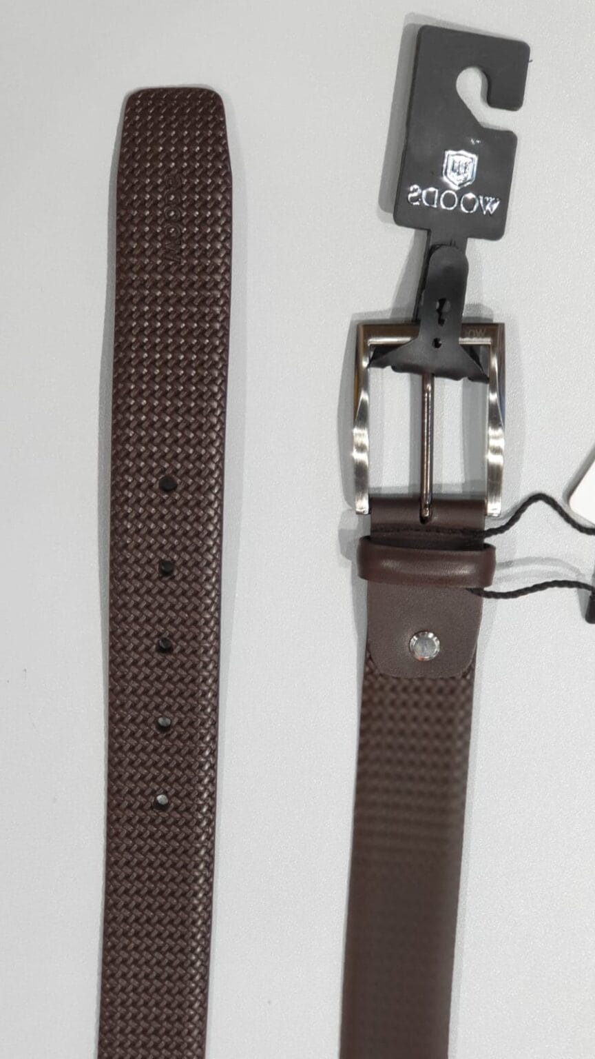 - Spruce up your look with this tan menâs leather belt from Woodland which features a beautiful textured pattern in stripes. Premium and great looking, it would accentuate the overall look of your attire and make a distinct style statement. The belt is carved out of fine leather, and will therefore maintain its quality and look for years to come. For ease of wearing, it comes with a metal buckle closure with a dull golden finish.