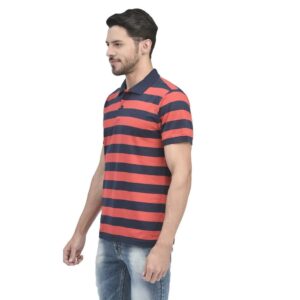 - Give your casual look a fresh feel with the relaxed fit of this blue/navy polo t-shirt from Woods. Crafted from cotton elastane blend the polo t-shirt for men is soft on skin, durable and maximizes comfort. The polo t-shirt for men features embroidered logo on chest, straight hemline, two button at placket, and contrast ribbed detail on color, sleeve and placket.